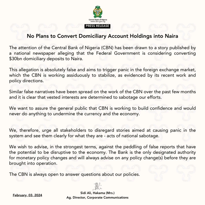 The statement reads: ” The attention of the Central Bank of Nigeria (CBN) has been drawn to a story published bya national newspaper alleging that the Federal Government is considering converting $30bn domiciliary deposits to Naira.
