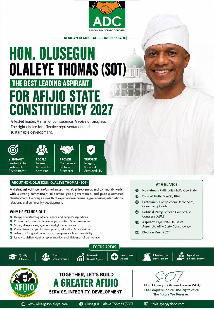 Olusegun Olaleye Thomas (SOT) is the Best Leading Aspirant for Afijio State Constituency for 2027