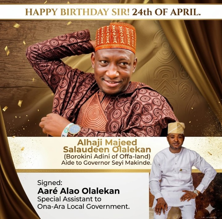 Alhaji Majeed Salaudeen Olalekan, popularly known as the Borokini Adini of Offa-land and aide to the Governor of Oyo State, His Excellency Engr. Seyi Makinde, has been celebrated on the occasion of his birthday today, 24th of April.