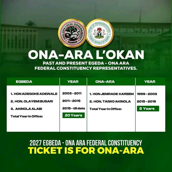 The group therefore urged all major political parties including the APC, ADC, PDP, and others to zone the 2027 House of Representatives ticket to Ona-Ara Local Government and present a credible Ona-Ara son or daughter as their candidate.