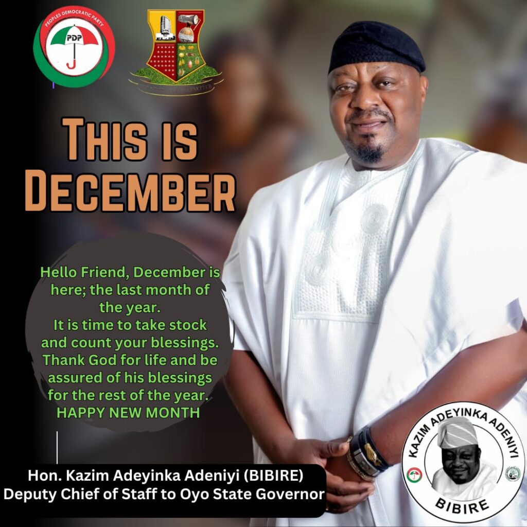 As the year draws to a close, the Deputy Chief of Staff to Oyo State Governor, Hon. Kazim Adeyinka Adeniyi Bibire, has extended warm greetings to the people of Oyo State, celebrating the arrival of the month of December with heartfelt appreciation and renewed optimism.