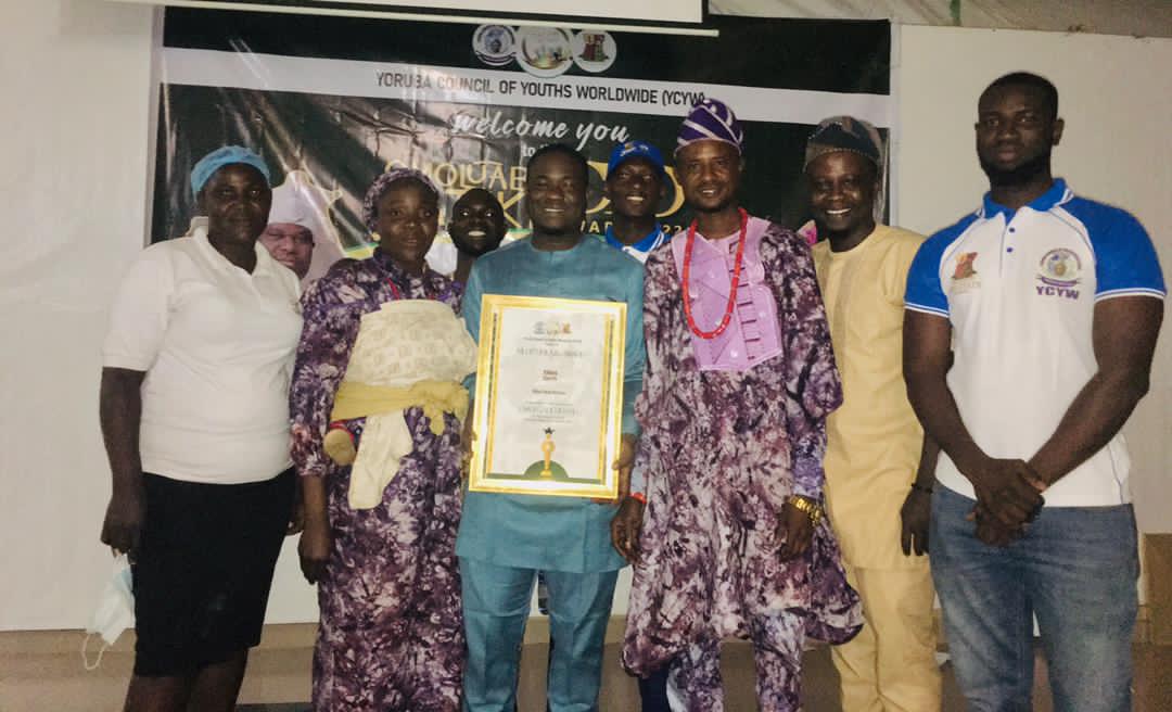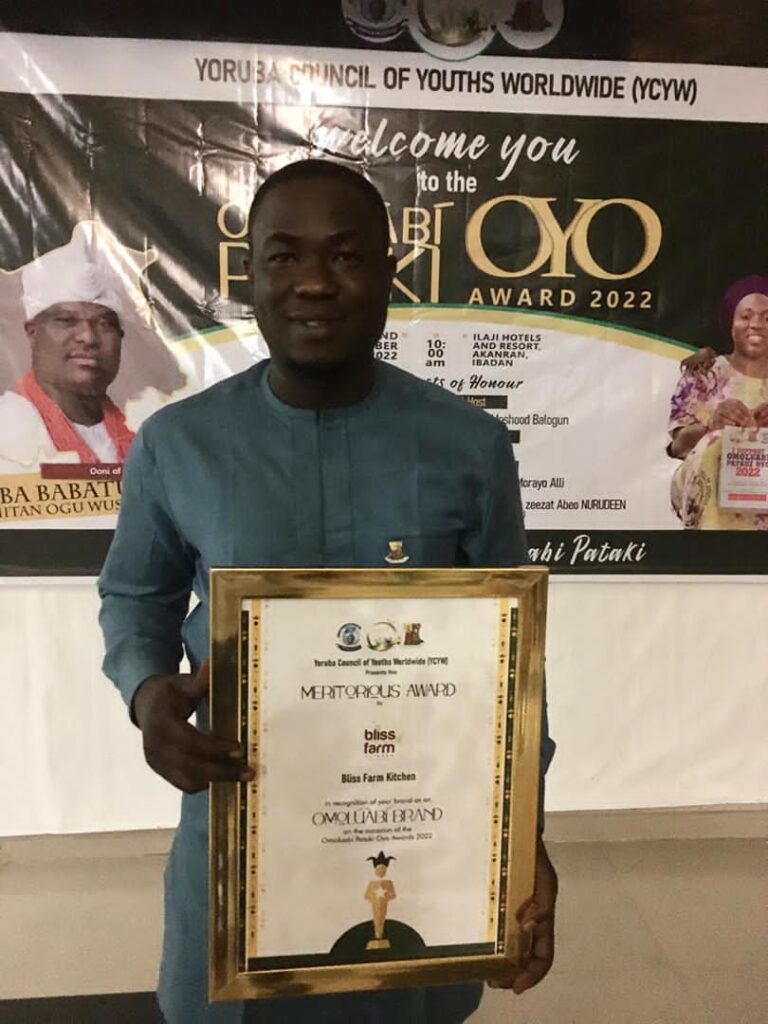The Apex Yoruba socio cultural group, Yoruba Council Of Youth Worldwide (YCYW) Oyo State chapter led by Aṣojú Ọdọ Alawode Akintunde Rahmon has presented an award of “Outstanding Omoluabi Pataki brand award” to the CEO of BlissFarm Kitchen and Bar located at Sawia Bus-stop, Olorunsogo, Akanran Road, Ibadan, Oyo State.