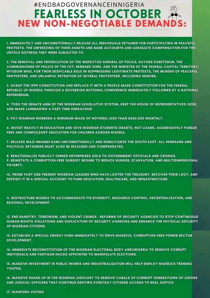 Other demands are: “The removal and prosecution of the Inspector General of Police, Kayode Egbetokun, the Commissioner of Police of the FCT, Bernard Igwe, and the Minister of the Federal Capital Territory Nyesom Wike, for their despicable role in suppressing legitimate protests, the murder of peaceful protesters, and unlawful detention of several protesters, including minors.