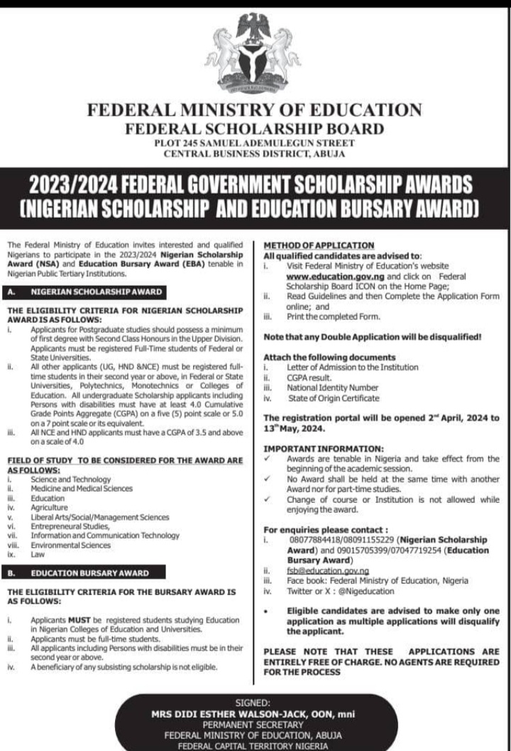 Tagged, “2023/2024 FEDERAL GOVERNMENT SCHOLARSHIP AWARDS (NIGERIAN SCHOLARSHIP AND EDUCATION BURSARY AWARD)”, the Federal Ministry of Education invited interested and qualified Nigerians to participate in the 2023/2024 Nigerian Scholarship Award (NSA) and Education Bursary Award (EBA) tenable in Nigerian Public Tertiary Institutions.