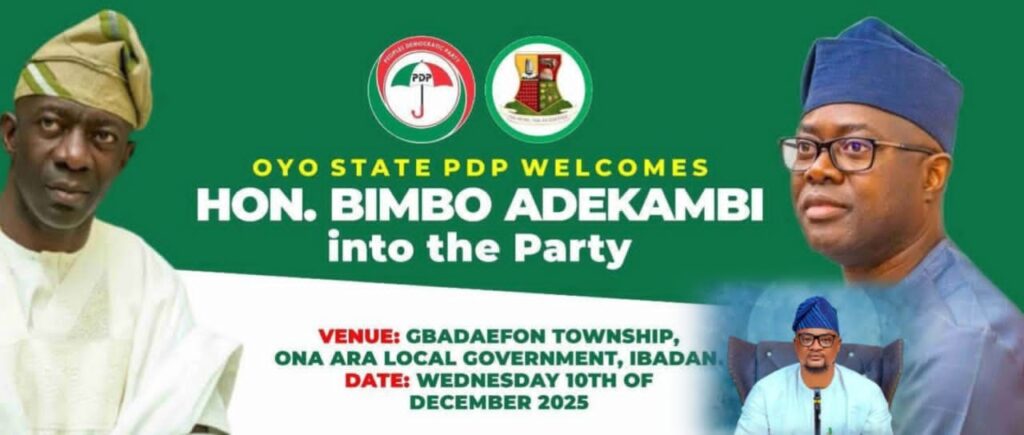 Egalitarian Voice reports that Hon. Bimbo Adekanmbi, a former Commissioner for Finance under the late Governor Abiola Ajimobi, has formally announced his defection to the Peoples Democratic Party (PDP). The declaration ceremony attracted top political figures, including the Oyo State PDP Vice Chairman, Alh. Wasiu Adeleke; Ona-Ara PDP Chairman, Alh. Kehinde Adeyemo; Ona-Ara Local Government Chairman, […]