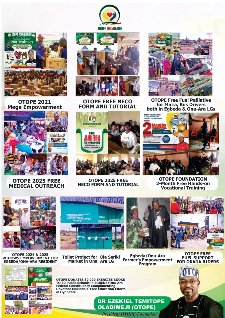 While others are still searching for a boasting right as small as a mustard seed, OTOPE has built a mountain out of a molehill of service. When they claim to be preparing for office, OTOPE has already prepared the ground, planted the seed, and is watering the harvest. The numbers do not lie. Since 2021, through the OTOPE Foundation, over forty distinct empowerment programs and projects have touched the lives of constituents in Egbeda and Ona-Ara. This is not a promise booklet; it is a ledger of liberation and a track record that reflects sustained involvement in grassroots development.