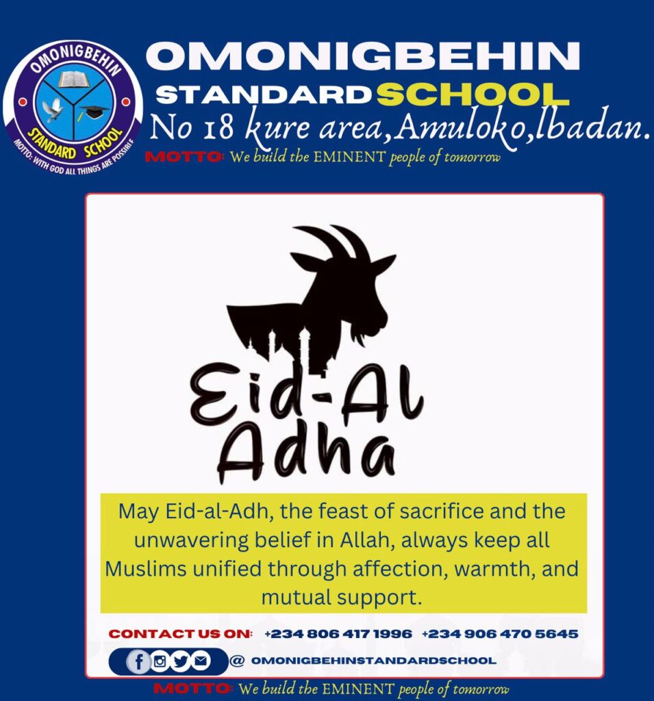 Omonigbehin Standard School, located at No. 18, Kure Area, Amuloko, in Ona-Ara Local Government Area of Ibadan, joins in celebrating this significant Islamic festival with joy and reverence.