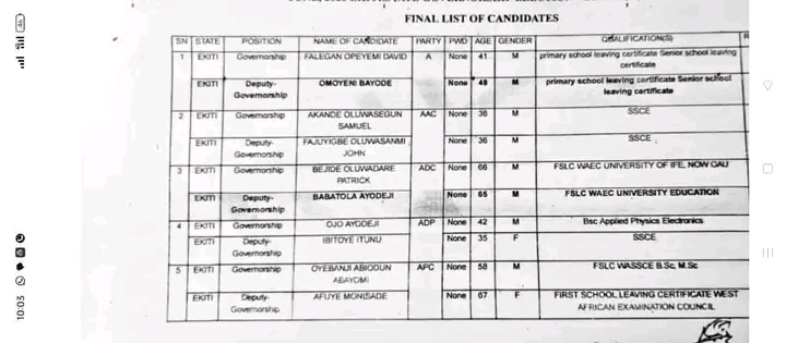 The Independent National Electoral Commission (INEC) has released the final list of candidates cleared to contest the June 2026 Ekiti State governorship election, setting the stage for a multi-party battle involving 12 political parties.
