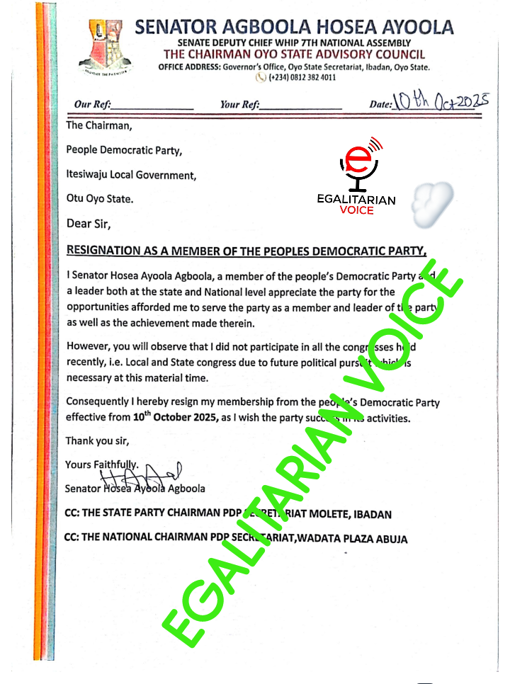 In a resignation letter sighted by Egalitarian Voice dated 10th October 2025, addressed to the PDP Chairman, Itesiwaju Local Government, Otu, Oyo State, Senator Agboola expressed gratitude to the party for the opportunity to serve both at the state and national levels.