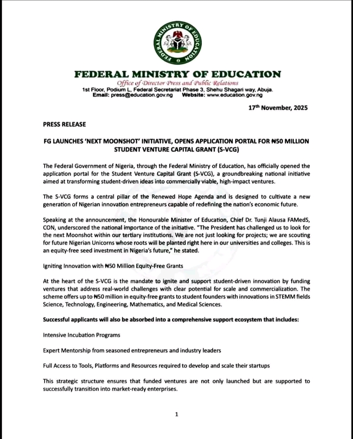 The Federal Government of Nigeria, through the Federal Ministry of Education, has officially opened the application portal for the ₦50 Million Student Ventures Capital Grant, a strategic initiative designed to empower young innovators, boost student-led entrepreneurship, and strengthen Nigeria’s knowledge-driven economy.