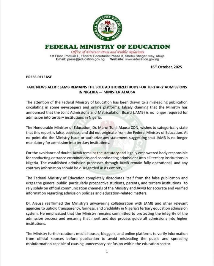 “At no point did the Ministry issue or authorize any statement suggesting that JAMB is no longer mandatory for admission into tertiary institutions,” Dr. Alausa stated.