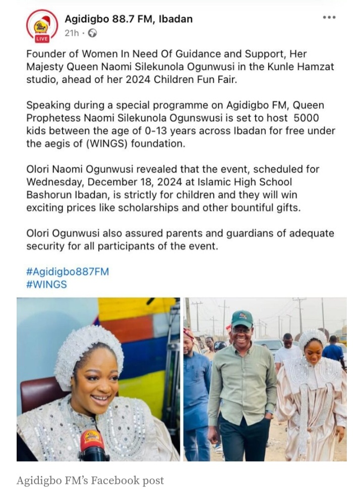 In a post by Agidigbo FM on Tuesday on Facebook, the station explained that Queen Naomi was set to host the party under the aegis of WINGS Foundation.