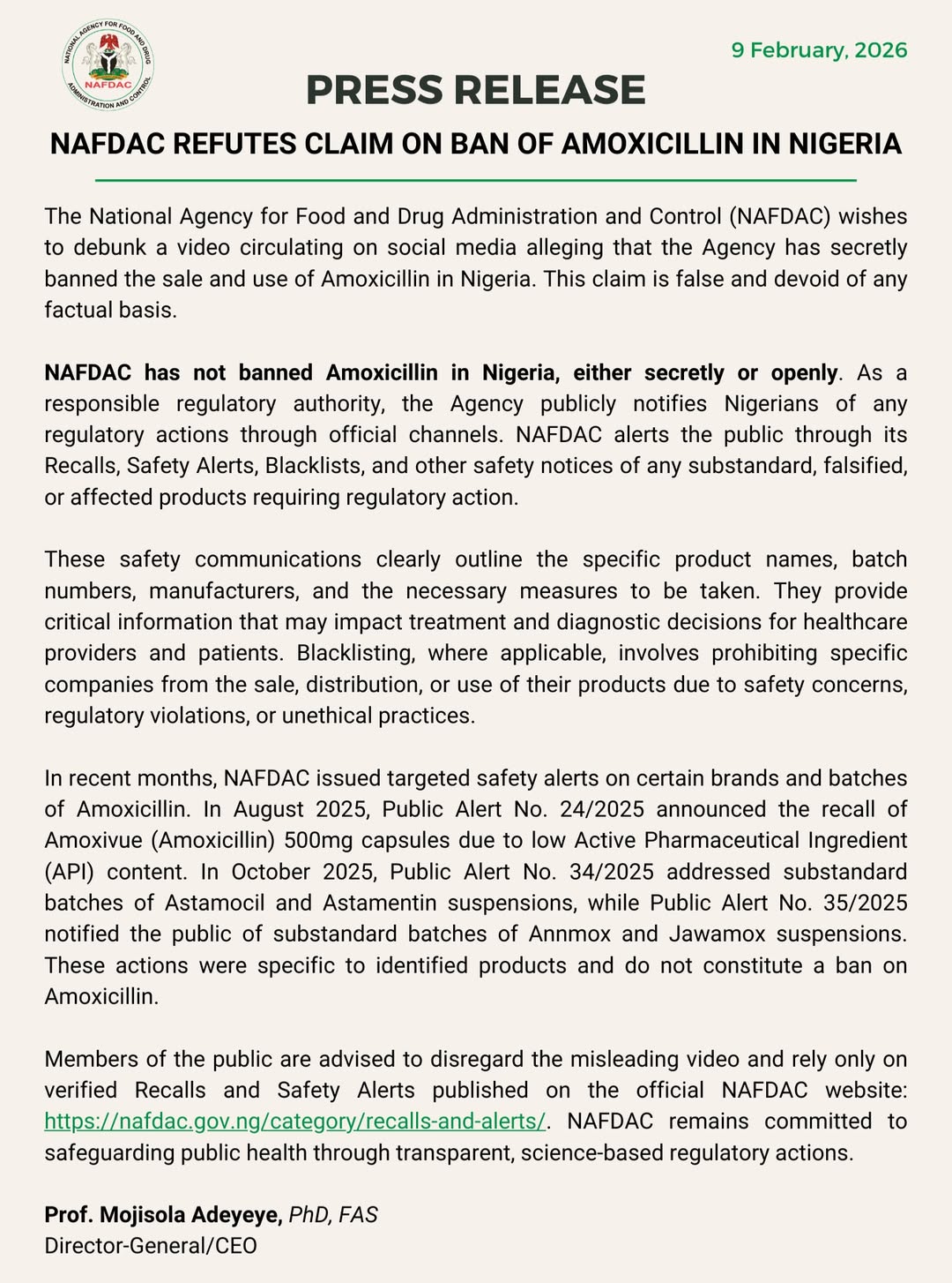 The National Agency for Food and Drug Administration and Control (NAFDAC) has debunked a viral video falsely claiming that the antibiotic amoxicillin has been secretly banned in Nigeria.