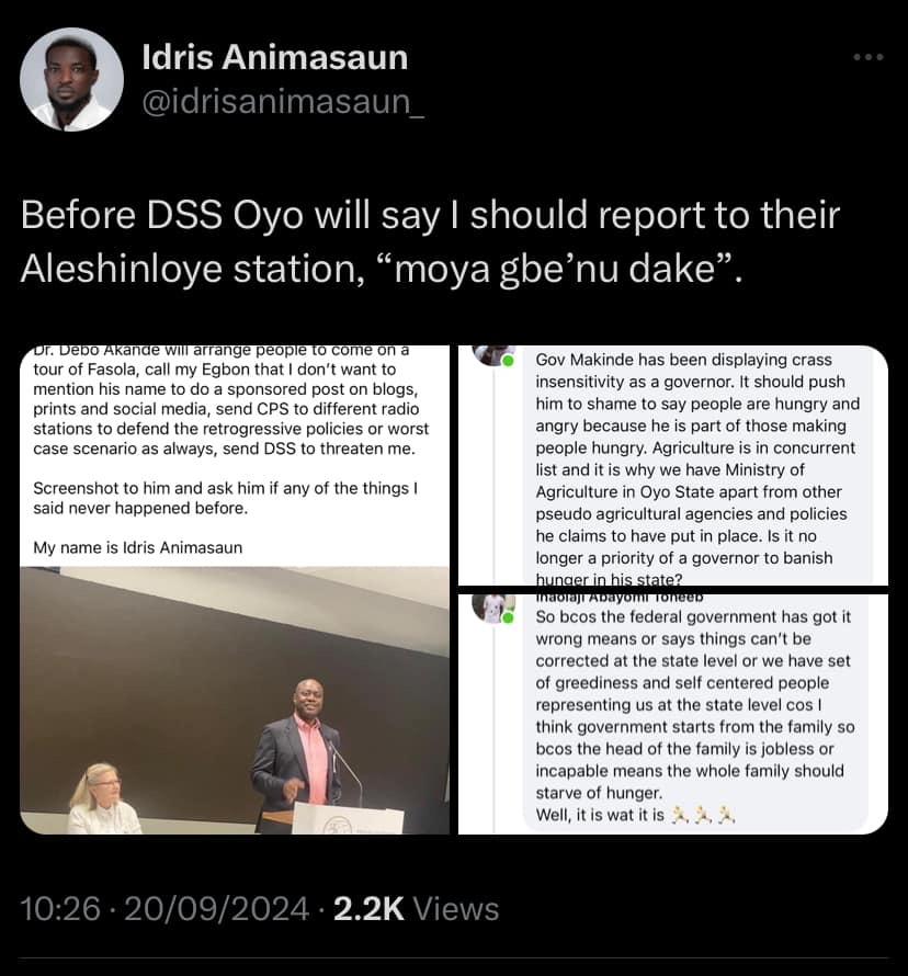 Idris Animashaun, a social media personality known for speaking truth to power, has been invited by the Department of State Services (DSS) for allegedly criticising Oyo State Governor Seyi Makinde’s governance.