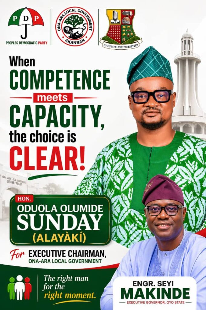 In this regard, Hon. Oduola Olumide Sunday (ALAYÀKÍ) clearly stands out as the right choice for Council Chairman—offering a blend of experience, grassroots understanding, and purposeful leadership that aligns with the aspirations of the people of Ona-Ara.