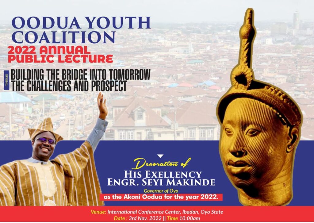 He further stated that the group, OODUA YOUTH COALITION; a socio-cultural youth organization is committed to the promotion and mentorship of excellent youths in the area of leadership, governance, management and welfare of the people, after a rigorous nomination, and online poll result by youths across the States in the Southwest has chosen Governor Seyi Makinde of Oyo State to be decorated AKONI Oodua for the year 2022.