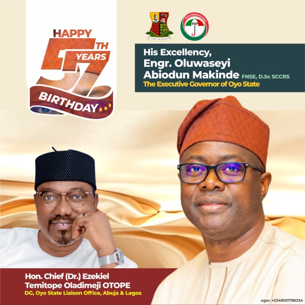 The Director-General Liaison office, Abuja and Lagos, Hon. Chief (Dr.)Ezekiel Temitope Oladimeji (OTOPE) has congratulates the Executive Governor of Oyo State, Engr. Oluseyi Abiodun Makinde FNSE on his 57th birthday celebration today 25th December, 2024.