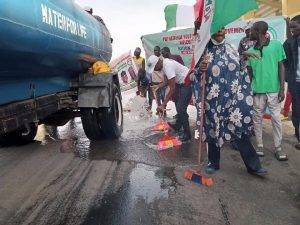 Supporters of the Peoples Democratic Party (PDP) in Jos, Plateau State on Wednesday took Nigerians by surprise as they march to the venue of the All Progressives Congress (APC) campaign flag-off for cleaning.