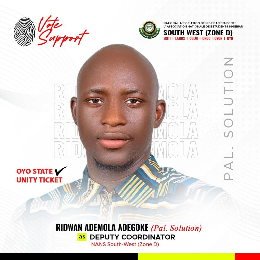 I, Ridwan Ademola Adegoke (Pal. Solution), hereby formally declare my interest to contest for the position of Deputy Coordinator, NANS South-West (Zone D). It is with a deep sense of responsibility, commitment, and vision that I present myself to serve our great association. Having closely observed the workings of our zone, I am prepared to contribute my experience, energy, and strategic insight toward meaningful progress.