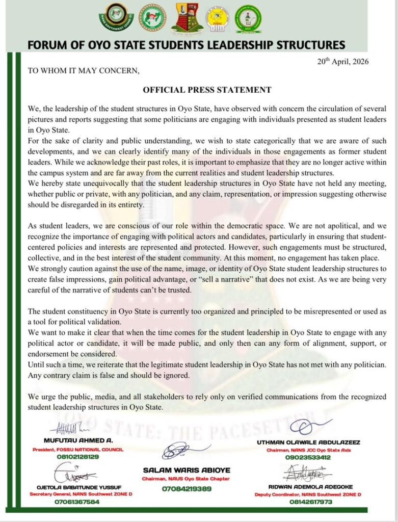 We, the leadership of the student structures in Oyo State, have observed with concern the circulation of several pictures and reports suggesting that some politicians are engaging with individuals presented as student leaders in Oyo State.