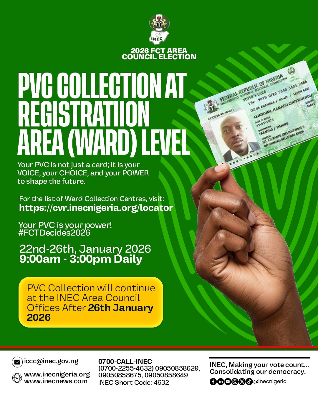 According to the Commission, the PVC collection exercise will run from January 22 to January 26, 2026, across all Registration Areas (Wards) within the FCT.
